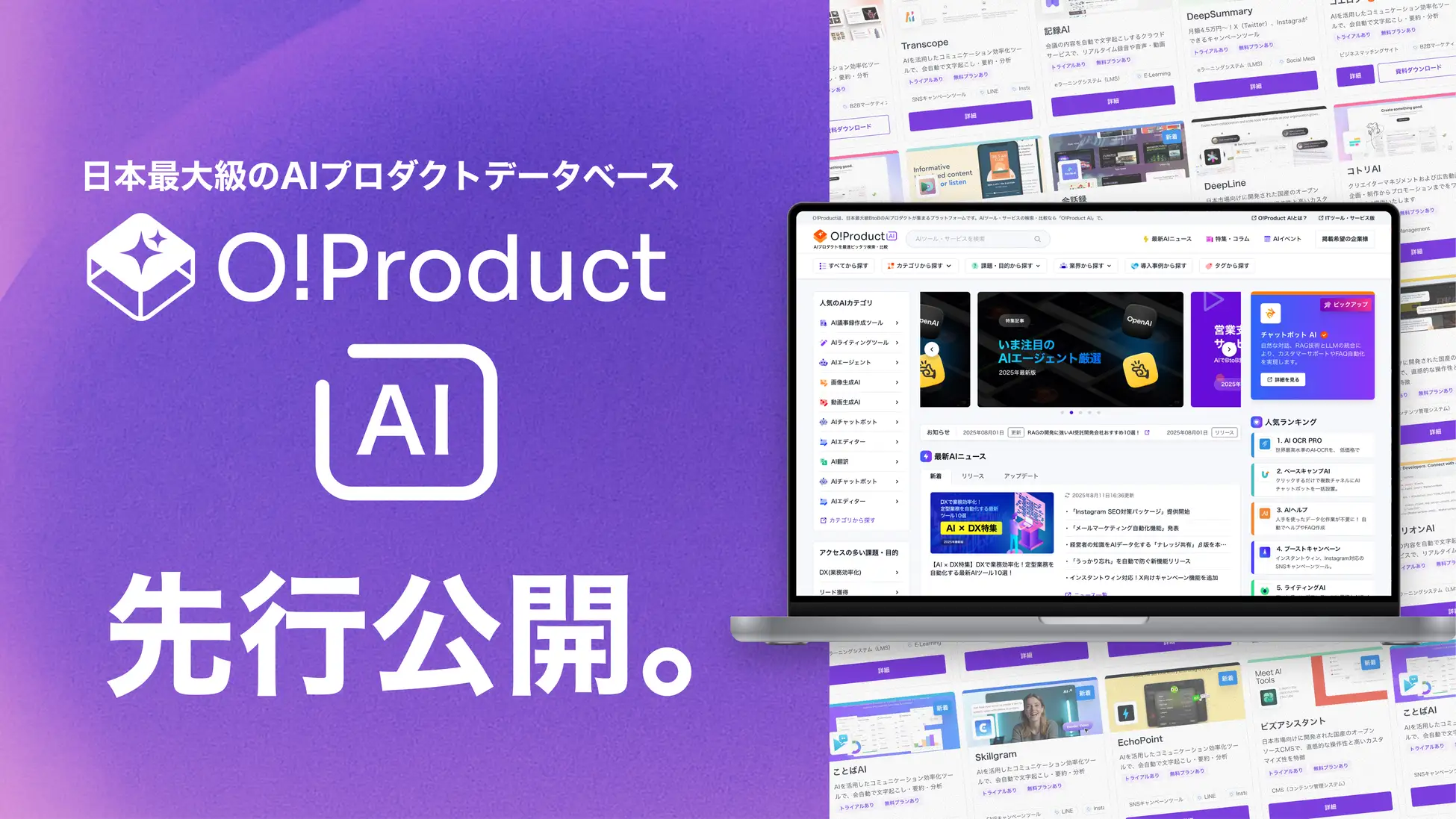 【日本最大級のAIプロダクトデータベース】自社に最適なAIが見つかる比較・検索サイト「O!Product AI」先行公開